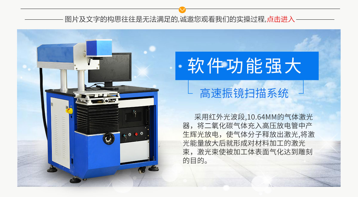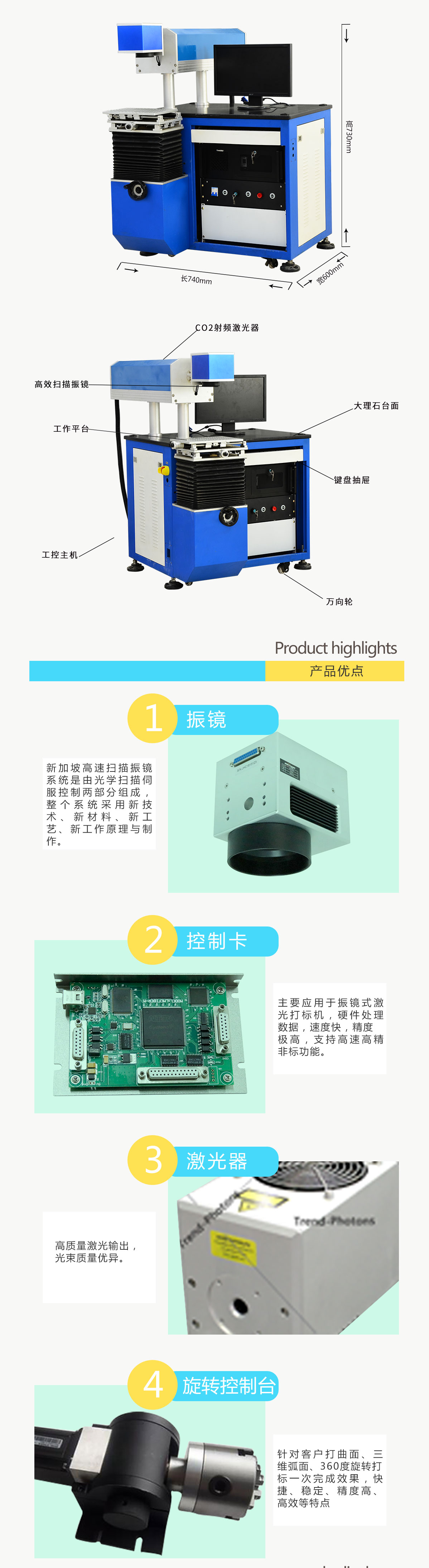 通過電腦控制振鏡改變激光束光路實(shí)現(xiàn)自動(dòng)打標(biāo)。 此款核心部件配置全部為國(guó)內(nèi)主流品牌,如CO2射頻管、高速掃描振鏡等。保證了極高的雕刻精度和速度,性能及其穩(wěn)定,能夠長(zhǎng)時(shí)間連續(xù)工作。