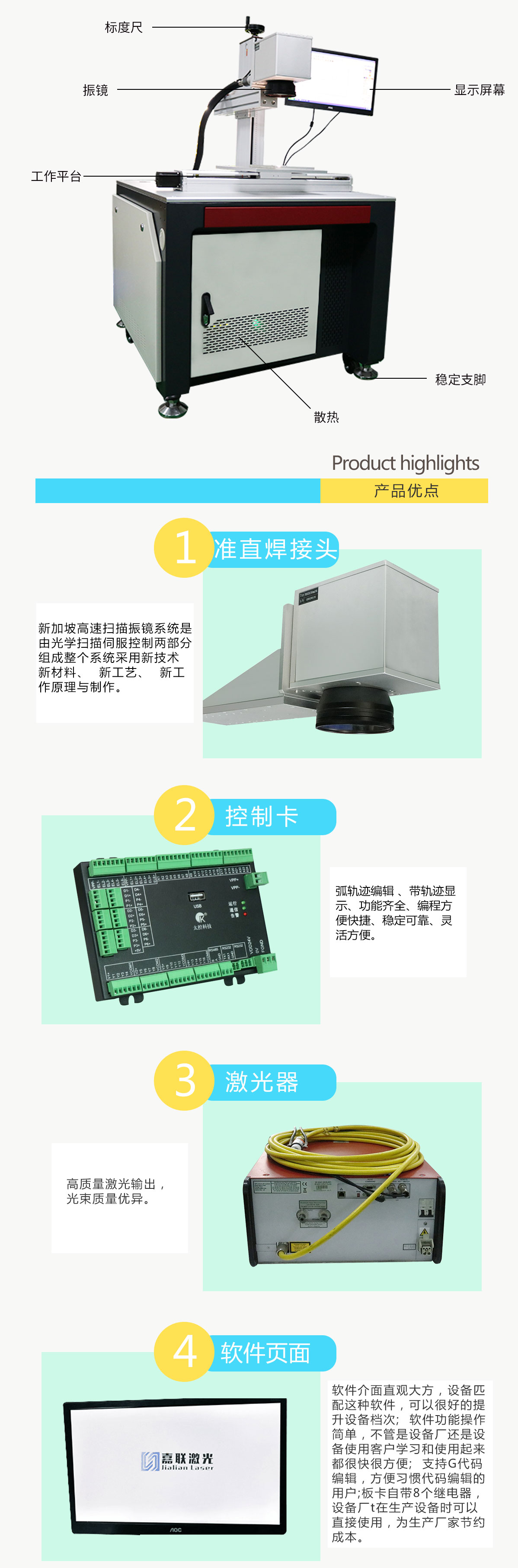 焊接速度是傳統(tǒng)電動(dòng)十字工作臺(tái)幾倍,具有焊接速度快、精度高、質(zhì)量穩(wěn)定、操作方便、維護(hù)簡(jiǎn)單等優(yōu)點(diǎn),特別適用各種零部件的激光精密點(diǎn)焊。生產(chǎn)效率達(dá)到普通激光點(diǎn)焊機(jī)的8倍左右。該機(jī)由YAG固體激光器、激光電源、光學(xué)掃描系統(tǒng)、平場(chǎng)聚焦系統(tǒng)、計(jì)算機(jī)、制冷系統(tǒng)、 激光指示系統(tǒng)、操作機(jī)柜等組成。在配備專用的激光焊接軟件后,焊接點(diǎn)或圖形可在軟件中直接輸入、 編輯,也可將AutoCAD、Coreidraw等其它軟件編輯的點(diǎn)或圖形通過(guò)該軟件進(jìn)行處理。